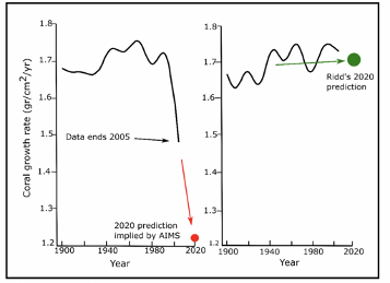 The main contention is between Ridd and the Australian Institute of Marine Science, which in a “landmark study” took cores from over 300 corals on the GBR and concluded that for the last 300 years, coral growth was stable, but in 1990 there was an unprecedented and dramatic collapse of 15%. The AIMS data from 2005 onwards is not being made available. Meanwhile, the AIMS data over 1990–2005 was questioned in relation to what appeared to be two mistakes.  AIMS admitted one but not the other one, which related to changed methodology. The disputed work, relating to the 1990–2005 data, is quoted in documents such as the 2019 Reef Outlook Report, which influenced government financial outlays on the GBR as well as activist commentary. Ridd and others contend, from their work, that coral growth rates are not in decline.
